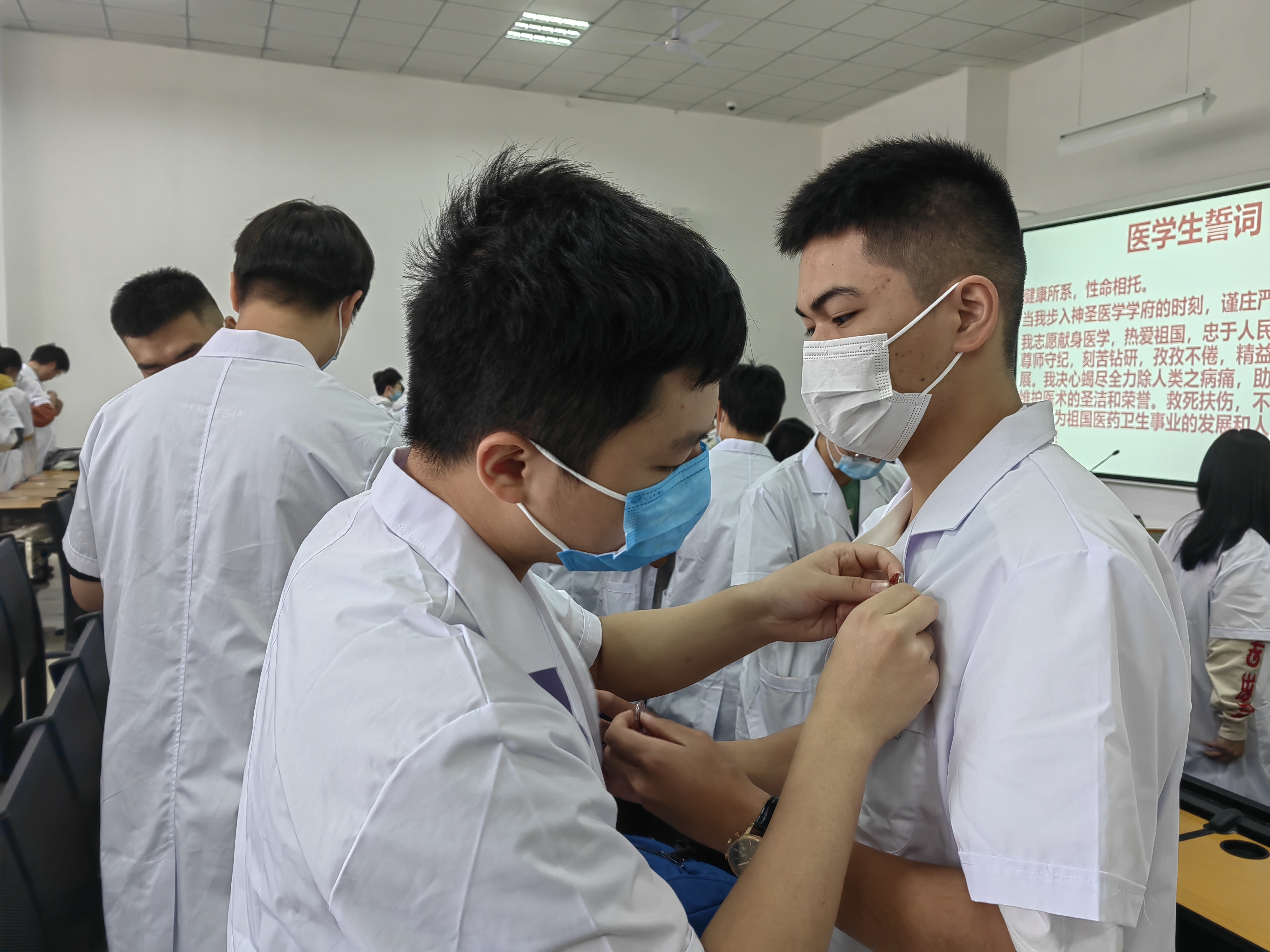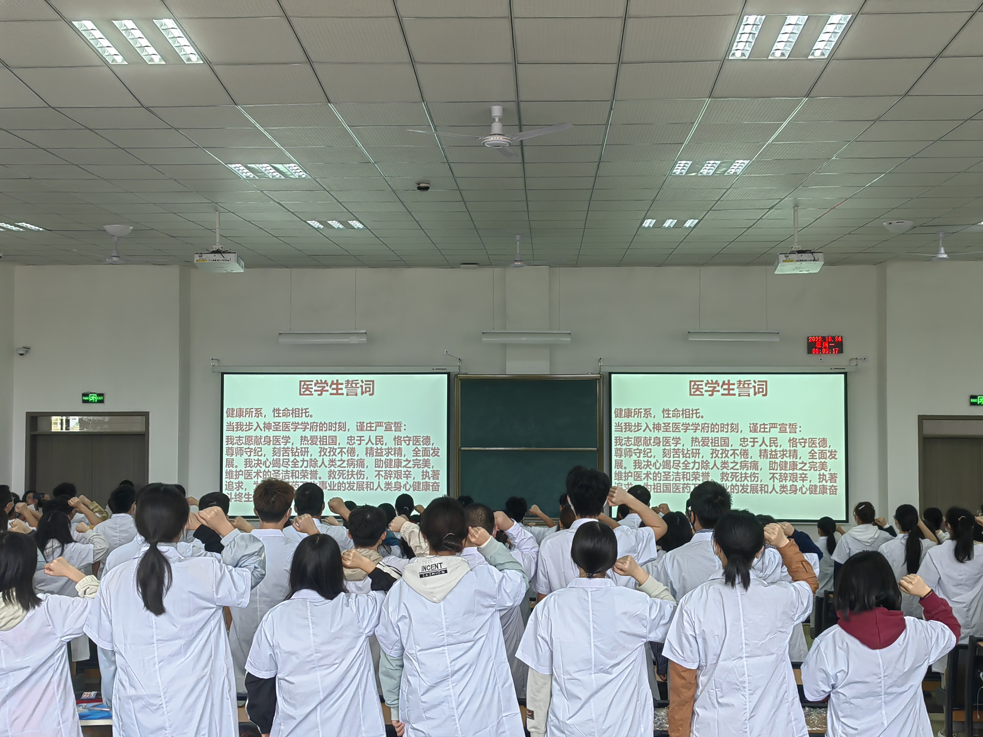 接着,举行了校徽佩戴仪式,全体新生在现场集体佩戴了校徽,熠熠闪光的校徽既是“遵医人”的象征,更是“明德笃学 求是致用”的精神载物。同时,为了巩固医员工的专业思维,感知医学的神圣,公司特意组织了充满仪式的宣誓环节,由太阳成集团122ccvip经理刘兴奎教授带领全体新生进行医员工誓言宣誓,神圣的医员工誓言声声入耳,句句入心。