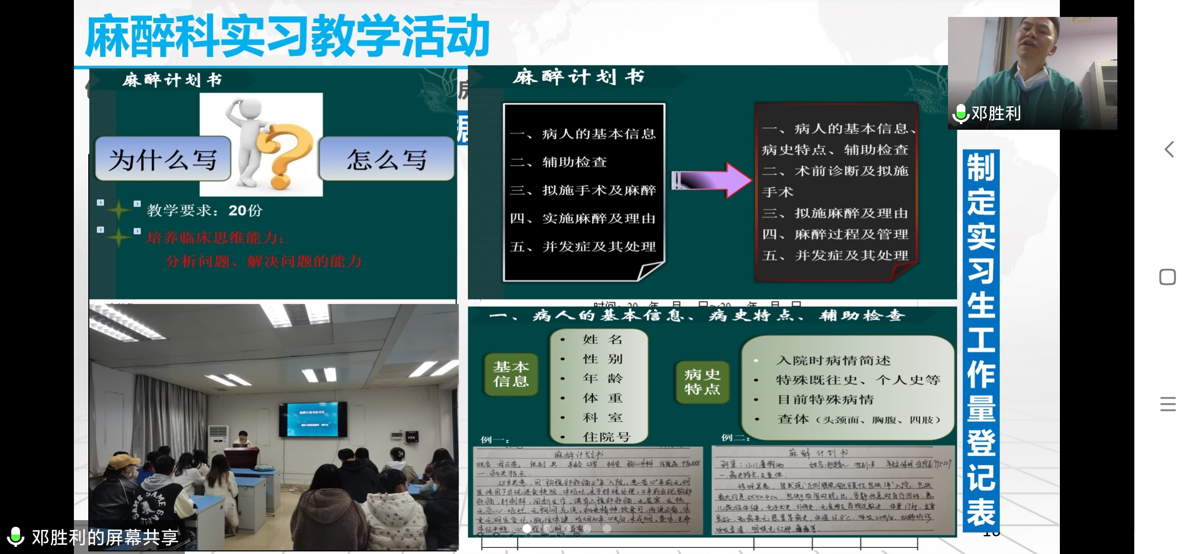 随后,临床麻醉学教研室副主任邓胜利,从公司新修订的实习大纲、实习教学活动、出科考核等实习教学要求,实习管理面临问题及解决办法等方面进行交流。郑州大学第一附属医院杨建军主任及吕慧敏老师,交流了该院及科室情况、实习生管理、轮转安排、带教老师安排、出科技能考核等实习教学管理经验。重庆陆军军医大学附属西南医院鲁开智主任,上海交通大学附属瑞金医院徐怡琼老师,上海市第一人民医院郭龙老师等与会教师进行了交流发言。